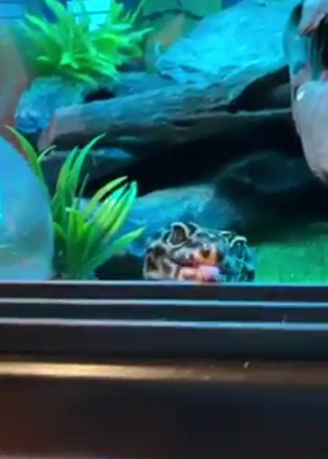 leopard gecko inside a terrarium. The gecko is mostly light brown with dark brown spots and is resting at the front of the enclosure, near the glass. Its head is prominently visible and slightly raised. In the background, the terrarium contains artificial plants, pieces of driftwood, and a water dish. The lighting appears blueish, possibly from the terrarium lights. The camera slowly zooms in on the gecko’s face.