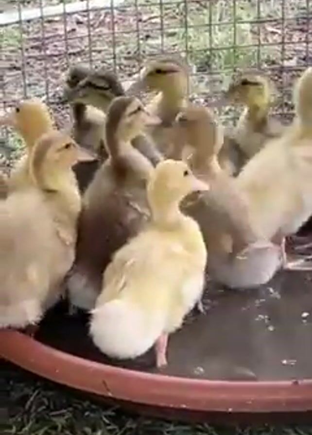 - "A cluster of about a dozen ducklings mill about in a shallow, circular, reddish-brown plastic water trough" by FM-A0fME3, licensed under CC BY 4.0