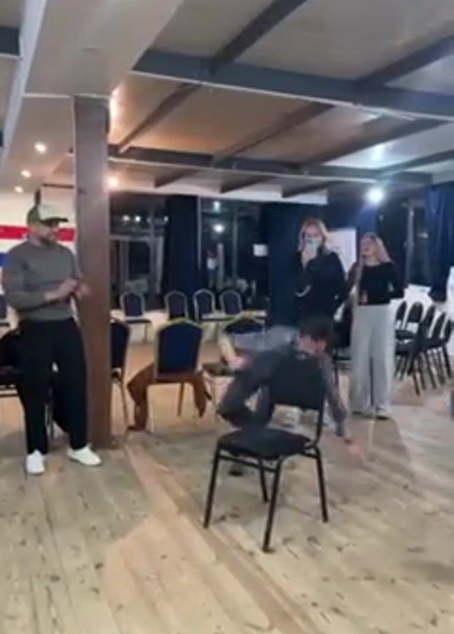 A man attempts a trick jump over a black chair, falls, and rolls onto the floor. He’s wearing a button-down shirt and gray slacks. A group of people watch, and some laugh, as he rises after the fall. One man wearing a gray sweater and baseball cap claps. They’re in a room with wooden floors and a scattering of black and blue chairs. There’s a pillar next to the man with the baseball cap. Some windows are visible at the back of the room. Overhead are exposed beams and multiple light fixtures.