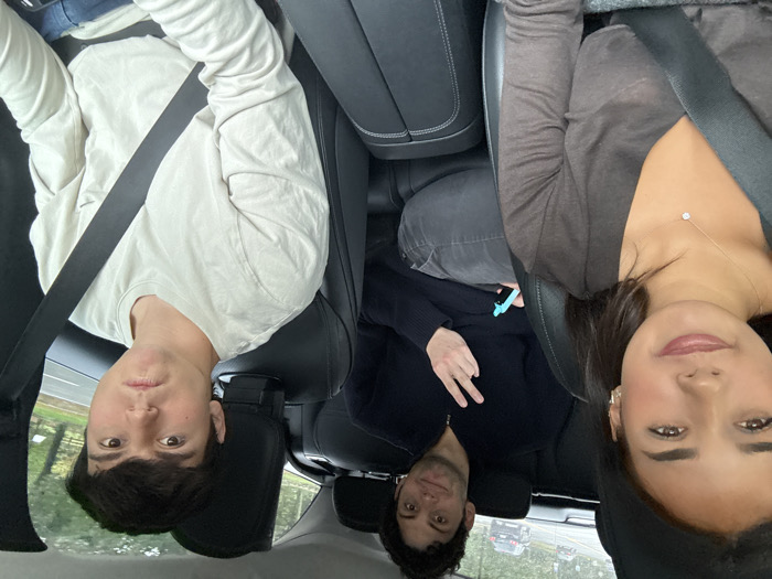 This image depicts three individuals seated inside a passenger vehicle, viewed from a forward-facing perspective