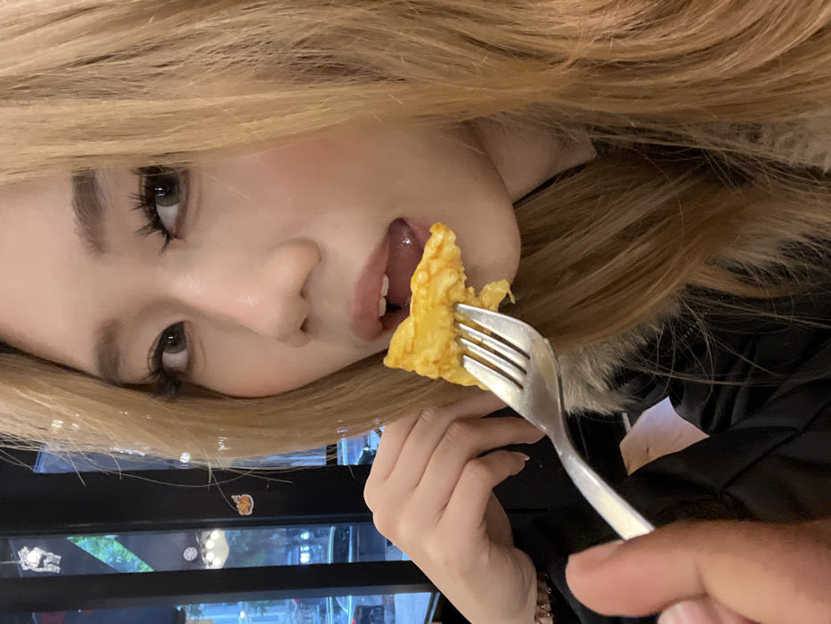 A close-up photograph captures an indoor scene, stated to be located in the city of Longta, China. The primary subject is a female with long, light brown hair, visible makeup including prominent eyelashes, and light-colored eyes. Her head is angled slightly, and her mouth is open, as she appears to be receiving food. A silver-colored metal fork, held by a hand partially visible in the lower-left corner of the frame, is positioned with a piece of yellow, cooked food directly in front of her open mouth. The woman's left hand is also partially visible, resting near her chin. She is wearing a dark-colored garment, possibly a jacket, with a lighter-colored, possibly fur-like, trim visible near her neck. The background is out of focus, revealing an interior setting with a large window. Through the window, an indistinct outdoor urban environment can be seen, characterized by ambient light, blurry shapes of vehicles, and architectural elements suggesting nighttime or low-light conditions. Several small, decorative objects are affixed to the window frame or nearby wall.