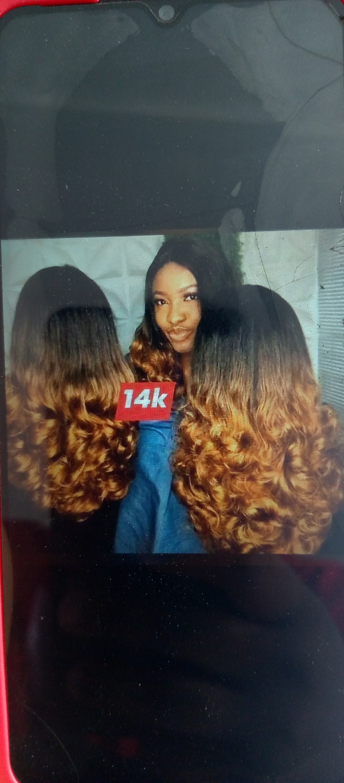 The scene, located in the city of Ukwu-Abwa, Nigeria, is captured as a photograph of a smartphone screen. The smartphone itself is partially encased in a red protective cover, visible on its left and top-right edges. The dark screen displays numerous light scratches, dust particles, and reflections. A small, circular front-facing camera lens is discernible at the top-center of the screen within a notch. The image displayed on the smartphone screen depicts an indoor commercial or studio setting. A woman of African descent is centrally positioned, shown from the chest up, with a subtle smile. She possesses long, wavy hair transitioning from dark roots to prominent auburn or light brown ends. She is wearing a blue, possibly denim, garment. Two distinct bundles of wavy hair, matching the color and style of the woman's hair, flank her on either side. A red rectangular graphic containing the white text "14k" is overlaid in the lower-middle portion of the displayed image, positioned between the woman and the left hair bundle. The background is a plain, light-colored wall with a subtle, possibly geometric or quilted, texture.