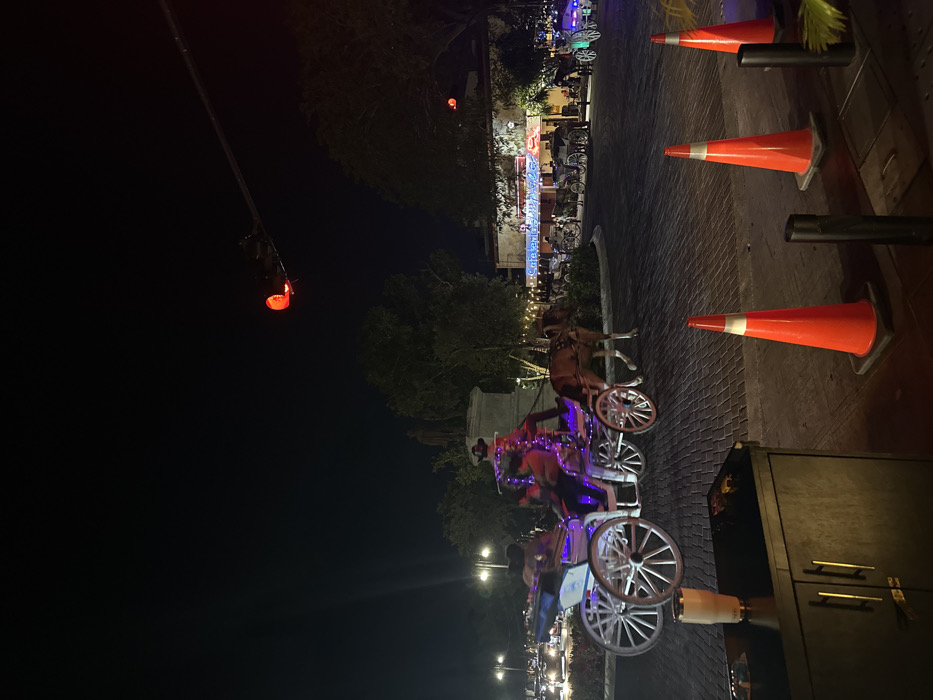 A nighttime street scene displays horse-drawn carriages lined up on a cobblestone street. The carriages are adorned with lights. Orange traffic cones mark the street's edge. A traffic light glows red in the upper left corner. Trees and a building with illuminated signs form the backdrop.
