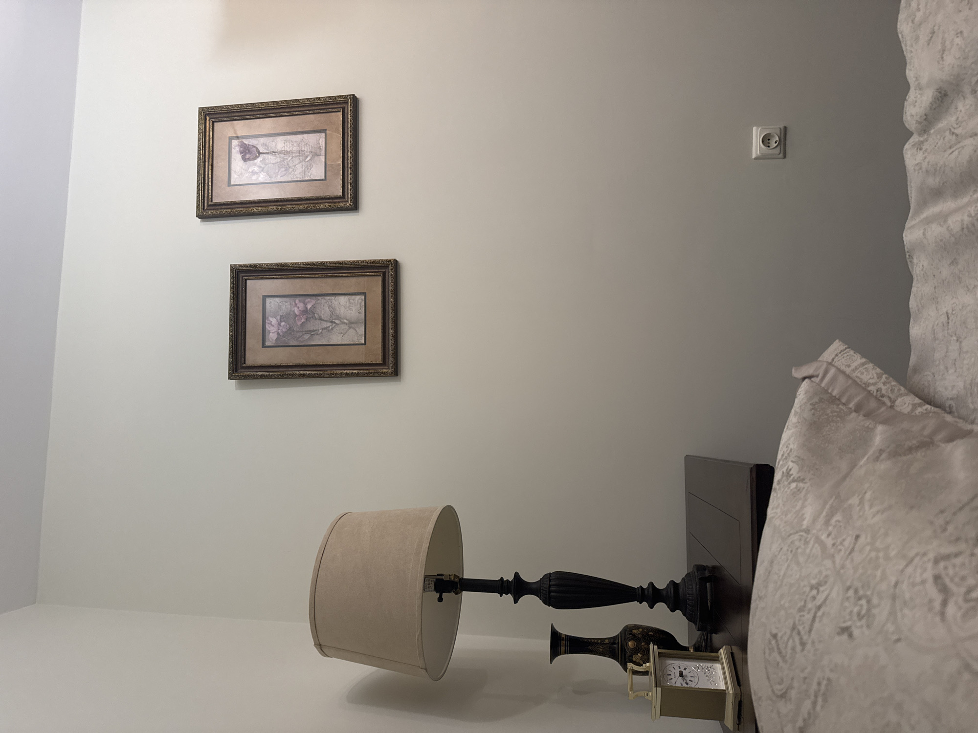 The image depicts an interior room with light-colored, possibly off-white, walls and ceiling. The specific location within Vidin, Bulgaria, is not discernible from the visual evidence. On the wall, two framed pictures are hung; both feature dark brown frames with gold-toned decorative edges and contain botanical prints on light backgrounds with subtle script-like textures. The left frame encloses an image of pink or purple flowers on branching stems, while the right frame displays a single purple tulip. In the lower-left section of the image, a dark wooden surface, likely a nightstand, is partially visible. Resting on this surface is a table lamp with a dark, ornate base and a conical light beige fabric lampshade. To the left of the lamp, a dark, possibly ceramic, vase with gold decorative patterns stands upright. In front of the vase, a small, gold-toned carriage clock with a white face and black numerals is positioned. A white European-style electrical outlet, featuring two circular plug receptacles and grounding clips, is affixed to the wall in the lower right portion of the scene. The immediate foreground is occupied by bedding. A light-colored pillow with a patterned pillowcase (featuring a paisley or similar design) is visible on the left, partially obscuring the nightstand. To the right, a textured white duvet or blanket covers the lower edge of the frame. No individuals are present. The room is illuminated by ambient light; the lamp is unlit.