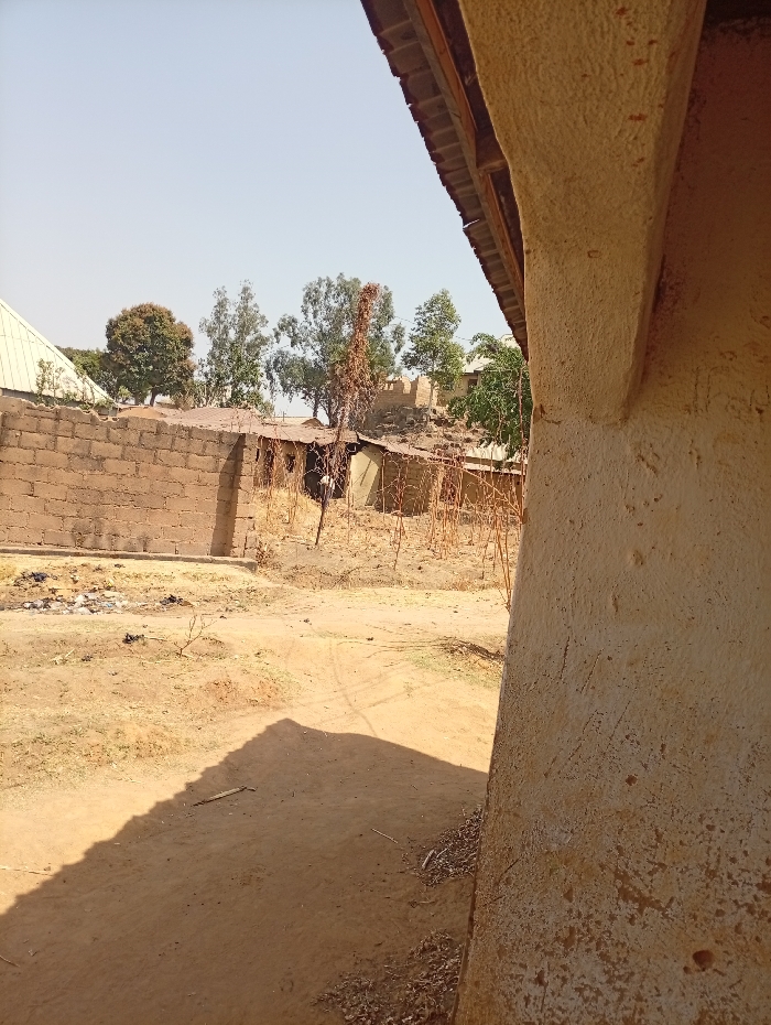 The image presents an outdoor scene in Barikin Gidar Kanat, Nigeria, viewed from beneath an overhang