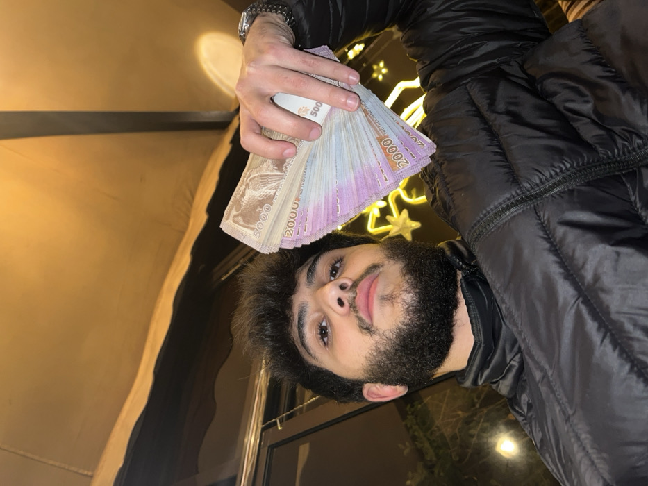 A person with a beard holds a thick stack of banknotes in their hand. The banknotes are mostly pink and white, with denominations of 2000 and 5000 visible. The person wears a dark, puffy jacket and a watch on their wrist. The background is dimly lit, and elements of a building and festive lights are visible. The image appears to be rotated.