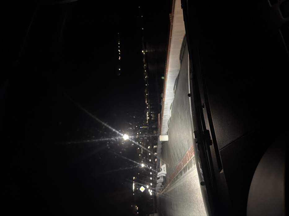 The image captures a nighttime view from within a vehicle, looking out onto the waterfront of Kavarna, Bulgaria. The immediate foreground reveals the vehicle's dashboard and windshield wipers. Headlights from the vehicle illuminate the paved ground directly ahead. Light refractions from the windshield create prominent starburst effects around multiple streetlights lining a promenade to the left. This promenade features a patterned red brick section and is bordered by a series of white, armless benches. A yellow diamond-shaped road sign is visible on the left side of the path. Across from the promenade, a low white concrete barrier or wall separates the paved area from a calm body of water, likely the Black Sea. Numerous distant lights are reflected on the water's surface and are discernible along the opposite shore. No individuals or specific actions are visible within the frame.