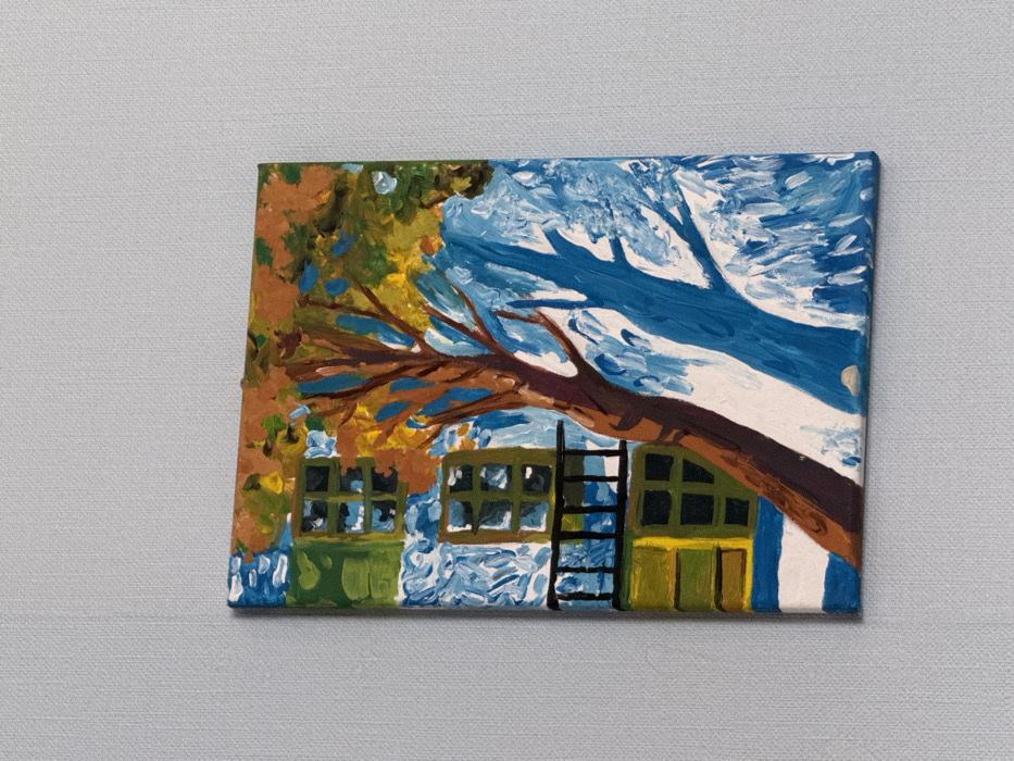 The image displays a small, unframed rectangular acrylic painting on canvas, mounted on a light gray, textured wall. The painting depicts a stylized outdoor scene located in Зура, Russia. On the left side, a multi-story building features a textured, light blue and white facade. Visible are at least five rectangular windows with dark green frames and dark interiors, and a black-railed balcony positioned centrally on the building, to the left of a prominent tree trunk. Below the balcony, a section of the building appears in yellow-green with another window. A thick, brown tree trunk diagonally spans from the lower center towards the upper right, adorned with autumn foliage in shades of orange, yellow, and green. To the right of this tree, the scene transitions into a dynamic composition of intense blue and white, characterized by strong, visible brushstrokes. Within this blue and white area, a distinct dark blue silhouette resembling a tree's branches is visible, suggesting a stylized winter landscape or a body of water with icy elements and reflections.