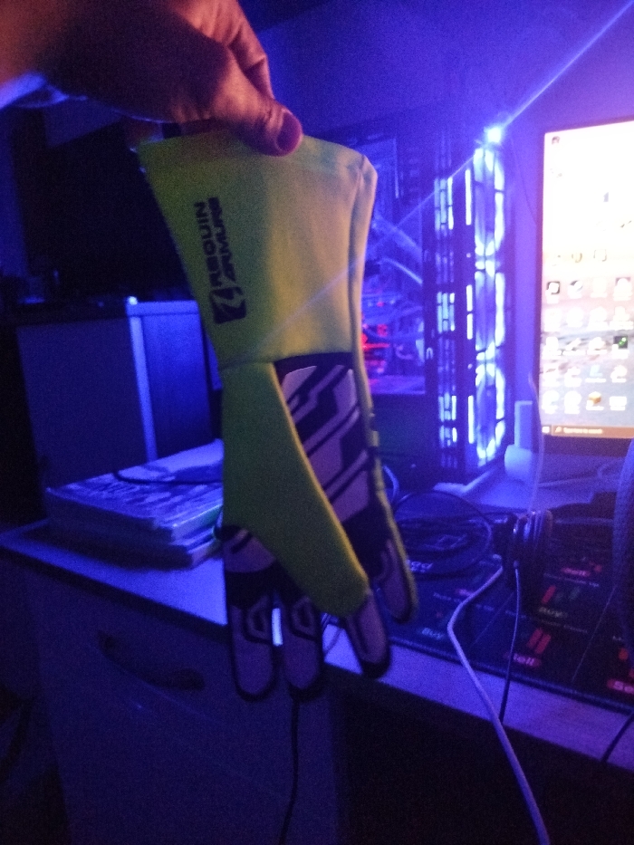 The image displays an indoor scene in Mirovyane, Bulgaria, primarily illuminated by artificial blue and purple light sources, indicating a low-light environment. In the upper center, a human hand with fair skin firmly grasps the cuff of a single neon-yellow glove, suspending it vertically. The glove bears the text "REQUIEM ARMORY" and a logo printed vertically on its dorsal side. Its palm and finger areas are adorned with black and white geometric patterns; one finger segment exhibits a distinct white rectangular mark. The background, from left to right, features a partially visible dark television or monitor, followed by a light-colored cabinet or shelf unit on which a stack of items, likely books or media cases, rests. Centered in the background is a desktop computer tower, internally illuminated by multiple blue LED lights emanating from its components and fans. To the right of the computer tower, a bright computer monitor displays a graphical user interface with numerous application icons. The foreground consists of a dark desk surface, upon which various entangled black and white cables are visible. Also on the desk are a white cylindrical object and a dark mousepad with red accents and partially visible text. The interaction depicted involves the human hand holding the glove.