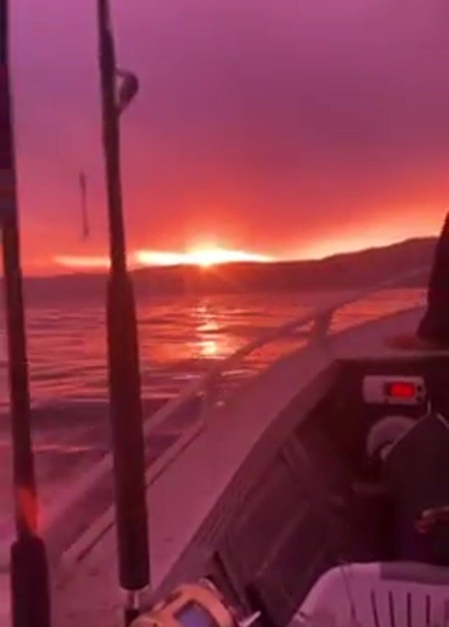 The scene shows the interior of a boat moving across water during a vibrant sunset. The sky is a deep pink and red, with the sun creating a bright glare on the water's surface. Two fishing rods stand upright on the left side of the boat, a fishing reel is visible on the boat near the rods, and the interior of the boat appears to be made of metal. There is a white basket toward the side of the boat as well. In the distance, land is silhouetted against the horizon. The boat's dashboard and navigation equipment are visible in the frame.