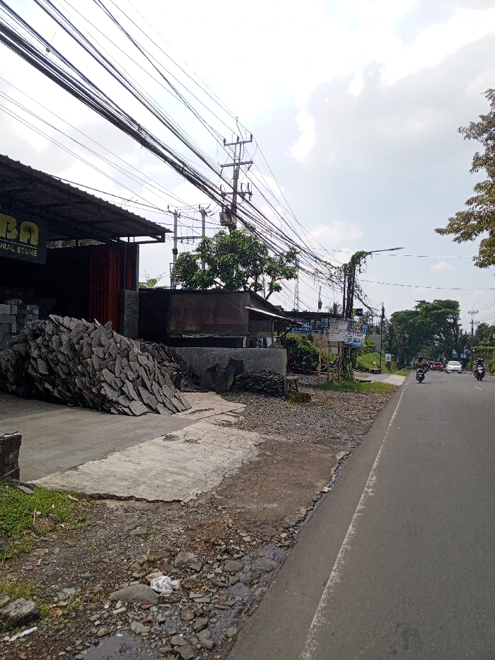 An outdoor scene depicts a busy roadside environment, stated to be in the city of Multhan, India, though specific identifying markers for this location are not discernible within the image. The foreground presents a gravel and patchy concrete shoulder alongside an asphalt road. A significant pile of dark, irregularly shaped natural stone slabs dominates the left side, positioned in front of a commercial building. This building features a dark corrugated metal roof and reddish-brown corrugated metal walls, with a partially visible sign indicating "BA" and "URAL STONE." Above the structures and spanning across the street, a dense network of numerous black electrical and communication wires is visible, supported by multiple utility poles. One wooden utility pole with a transformer is prominent in the mid-ground. To the right of the stone store, additional smaller structures, some appearing to be shacks with corrugated metal components, are present. The two-lane asphalt road extends into the distance, with a white line marking its right edge. Three vehicles are visible on the road, moving away from the viewer: two motorcycles with riders in the mid-ground and one white car further down the road. Green foliage and trees line the right side of the street and appear behind the roadside structures. The sky is overcast with a mix of white and grey clouds. A single street light pole is visible on the right, further down the road. Debris, including a white plastic bag, is scattered on the unpaved shoulder. No specific interactions between individuals are discernible.