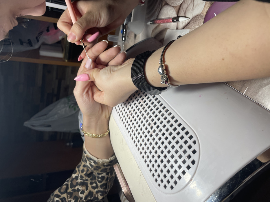 In Cherven Bryag, Bulgaria, the image captures a close-up, indoor scene within a nail salon. A nail technician, whose right arm and part of her head are visible on the right, is actively applying a white substance to the ring fingernail of a client's left hand using a fine-tipped, pink-handled tool. The client's left hand, featuring long, pointed pink fingernails, rests on a white, rectangular nail dust collector with a perforated grid surface. The client wears a gold link bracelet on her left wrist and part of a leopard-print sleeve. The technician's right wrist displays a black mesh watchband and a silver charm bracelet. On the work surface, next to the technician's arm, a pink pen-like tool filled with crystals is visible. The background is dimly lit, revealing a light-colored plastic bag and a dark, possibly wooden, textured wall.