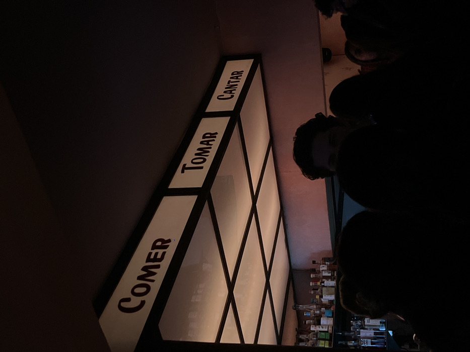 A dimly lit bar interior shows a triangular sign with the words "Comer", "Tomar", and "Cantar" in Spanish