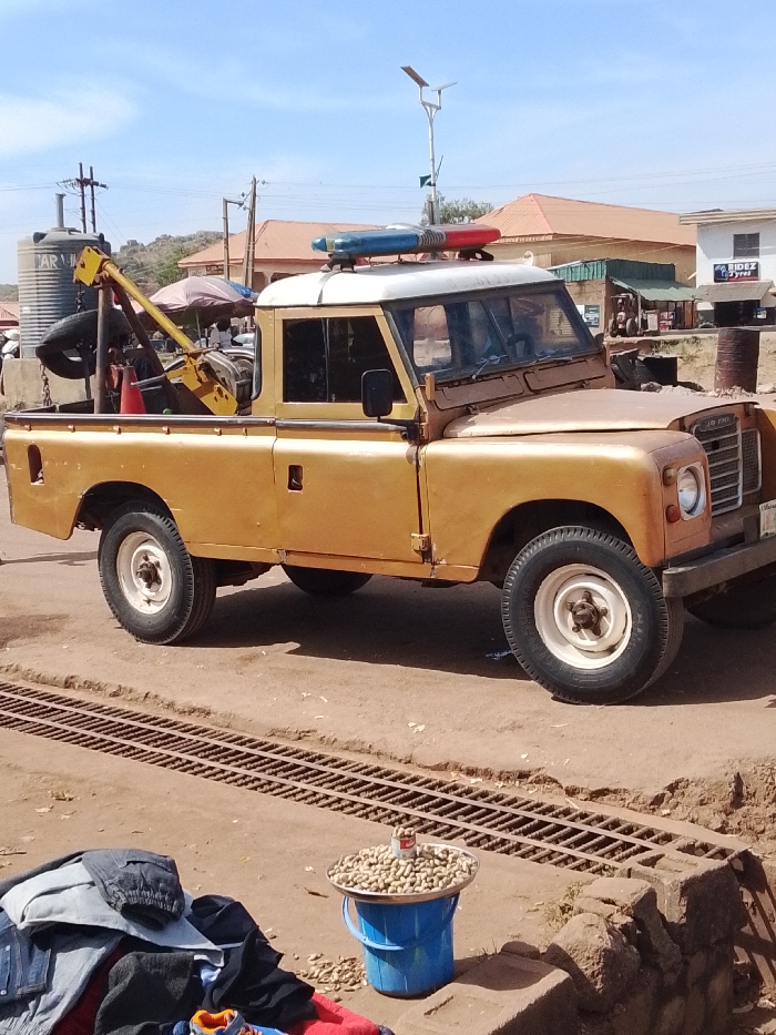 - "An outdoor daytime scene in Jos, Nigeria, depicts a gold-painted Land Rover Series II/III two-door pickup truck positioned on a reddish-brown dirt road, facing right" by FM-65atr1, licensed under CC BY 4.0