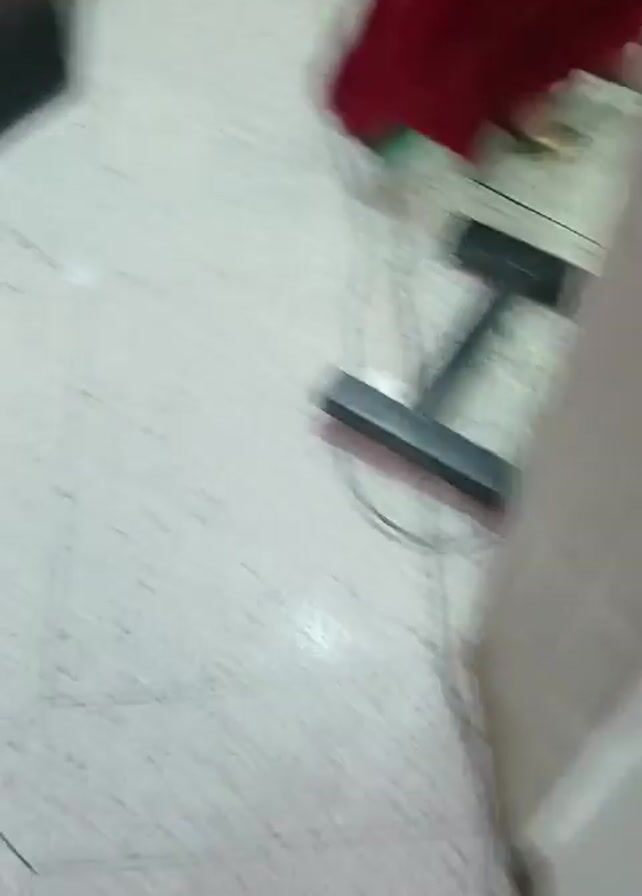 series of brief shots taken indoors. Initially, a corner of a wooden structure is seen, followed by footage of people stepping onto and standing on a black, roughly octagonal platform. The individuals are wearing various clothing, including a long blue garment, black pants, and white shoes. The floor is tiled in a light color. There is a lot of movement and some blur in the video.