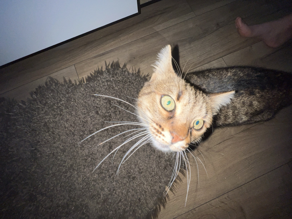The scene depicts an interior residential floor in the city of Beverwijk, Netherlands. The primary subject is a domestic cat, likely a tabby breed, with a fawn-brown head and darker brown striped body fur. The cat's head is tilted upwards and slightly to its left, directly facing the camera, with wide, round eyes exhibiting a green-blue hue and prominent light reflections. Long, white vibrissae extend outwards from its muzzle. The cat is positioned on a dark brown, shaggy-pile rug, which partially covers light brown wooden floorboards. In the lower right corner, a bare human right foot is visible, resting on the wooden floor. A bright, light-colored vertical surface, possibly a wall or screen, is present in the upper right background. The scene is illuminated by artificial light, casting distinct shadows.