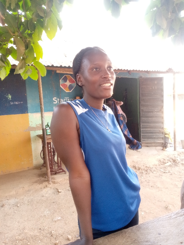 An outdoor, eye-level, half-length image taken in Maigizo, Nigeria, features a young adult female, approximately 20-30 years old, with dark skin and dark braided hair pulled back