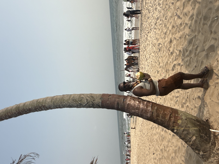 A man in sunglasses, a tank top, and shorts lounges on a beach with a coconut. He is positioned next to the base of a bent palm tree. Behind him, the beach is populated with people walking along the water's edge. The sky is a clear, pale blue, and the sand is light tan. A few sparse blades of grass are visible near the tree's base. The ocean stretches horizontally across the image in the distance.