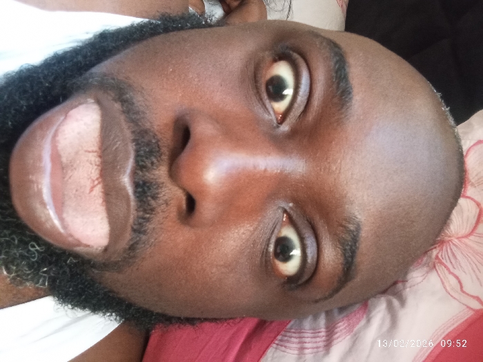 The image displays a close-up, vertically oriented view of an adult male's head and upper torso in an indoor setting. The specific location within Jos, Nigeria, cannot be determined from the visual evidence. The individual has dark skin, a shaved or bald head, and a dense, black, curly beard covering the chin and jawline. His eyebrows are well-defined. His eyes are wide open, pupils are dilated, and are fixated directly towards the camera. The visible sclera show a yellowish tint. The mouth is open wide, revealing the upper teeth and a pale pink tongue. The subject is positioned against a patterned fabric, consistent with bedding or a pillow, featuring a predominantly red/maroon background with lighter, possibly floral or abstract, designs. A section of white fabric is visible on the left side of the frame, likely clothing or another sheet. A digital timestamp in the bottom right corner of the original image reads "13/02/2026 09:52".