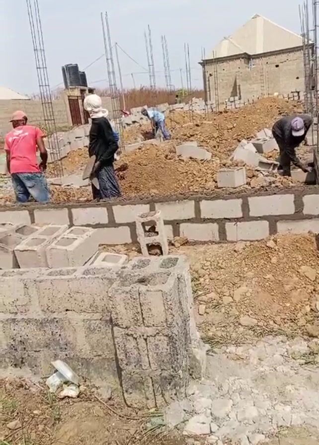 four people laying blocks for the foundation of a building under construction. Two men are kneeling and spreading mortar, while another carries blocks, and a fourth lays blocks in place. Rebar extends upwards from the foundation at intervals. The ground is uneven and mostly bare, with patches of grass and dirt. A finished building is visible in the background, as are the tops of buildings in the far distance. There are building materials, trash, and a water pipe on the ground in the foreground. The sky is overcast.