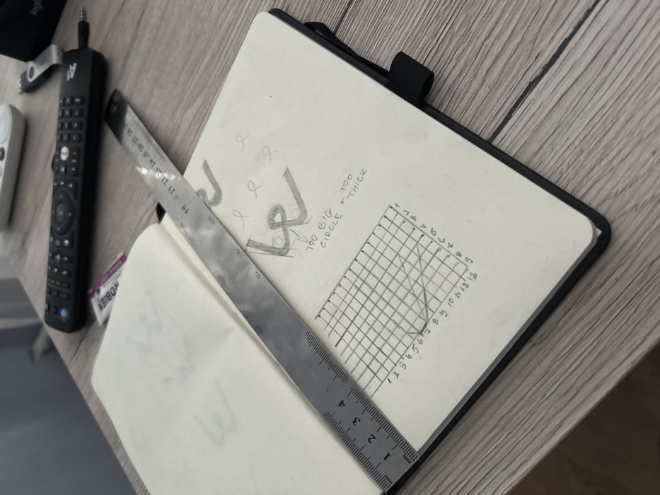 The image displays an overhead perspective of a light-colored wooden table surface in an indoor setting located in Kozloduy, Bulgaria. An open notebook with a black cover and white, unlined pages is centrally positioned. A metallic ruler, approximately 22 cm long and marked in centimeters and millimeters, lies diagonally across the notebook's open pages. The right page features multiple pencil sketches of a stylized "e" or similar curved letterform, with handwritten annotations "TOO BIG + TOO CIRCLE + THICK" accompanied by arrows. Below these sketches, a hand-drawn grid graph is present, depicting a line that descends then ascends, with an x-axis labeled 1-12 and a y-axis labeled 1-8. A black elastic band, likely part of the notebook's closure, is visible on the right side of the notebook. In the background, a black multi-button remote control is visible, positioned near a metallic USB flash drive. A small, crinkled wrapper with "MOBIE" partially legible in white text lies near the remote. A small, white, rounded electronic device is also partially visible in the upper background.