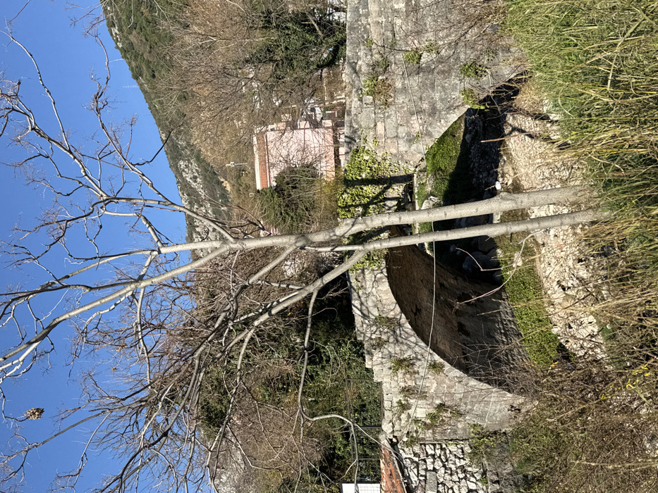 This image depicts an outdoor scene in Podostrog, Montenegro, on a clear day. A weathered, multi-arch stone bridge is centrally positioned, featuring at least two distinct arches spanning a dry riverbed composed of rocks, pebbles, and sparse vegetation. The bridge's stone blocks exhibit patches of green foliage, including vines. In the foreground, a prominent deciduous tree, devoid of leaves, presents multiple bare trunks and branches, partially obscuring the bridge. Dry, light-brown grasses occupy the immediate foreground. To the far left, a stone wall structure with a red-tiled roof is partially visible adjacent to the bridge. A light pink, multi-story building with a terracotta roof is situated in the midground, behind the bridge and other surrounding vegetation. A large, verdant mountain range, exhibiting rock outcrops, forms the background. The scene is illuminated by natural sunlight, casting shadows. No individuals or active subjects are present.