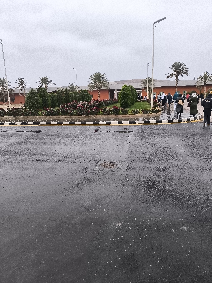 A wet asphalt road dominates the foreground, leading towards a building with an orange facade under a cloudy sky. Palm trees line the building, which is separated from the road by a strip of greenery featuring shrubs and flowers. Several people are walking towards the building's entrance. Lighting poles are visible along the side of the road.