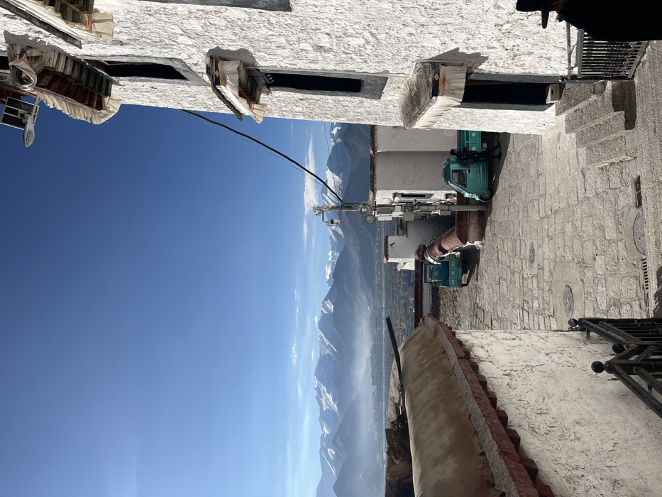 An outdoor, elevated scene depicts a paved stone pathway winding between traditional white-walled buildings, consistent with the architectural style found in Chengguan District, Lhasa, China. The sun illuminates the scene under a clear blue sky. In the foreground on the right, the textured white exterior of a multi-story building dominates, featuring several recessed windows adorned with traditional fabric awnings. A dark, ornate metal railing for a staircase ascends from the bottom right. A person in dark clothing and a black hat is partially visible on the far right edge, ascending or descending. The paved pathway, constructed from light-colored stone, leads into the midground where two teal-colored three-wheeled motorized utility vehicles are parked or stationary. A person in dark attire stands next to the front vehicle on the right. More white buildings with red-tiled eaves are visible beyond these vehicles, along with a utility pole equipped with lights and security cameras, from which black power lines extend diagonally upwards. In the background, a sprawling urban area lies in a valley, partially obscured by a light atmospheric haze. A large body of water, likely a river, is visible passing through the city. Beyond the urban landscape, a prominent range of snow-capped mountains extends across the horizon under the clear sky. A low, curved wall with red trim and a brown top runs along the left side of the pathway, obscuring the immediate drop-off.