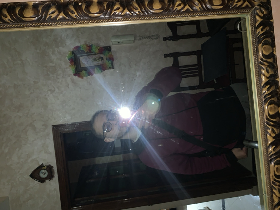A mirrored reflection shows a person wearing glasses, a hooded jacket, and a backpack