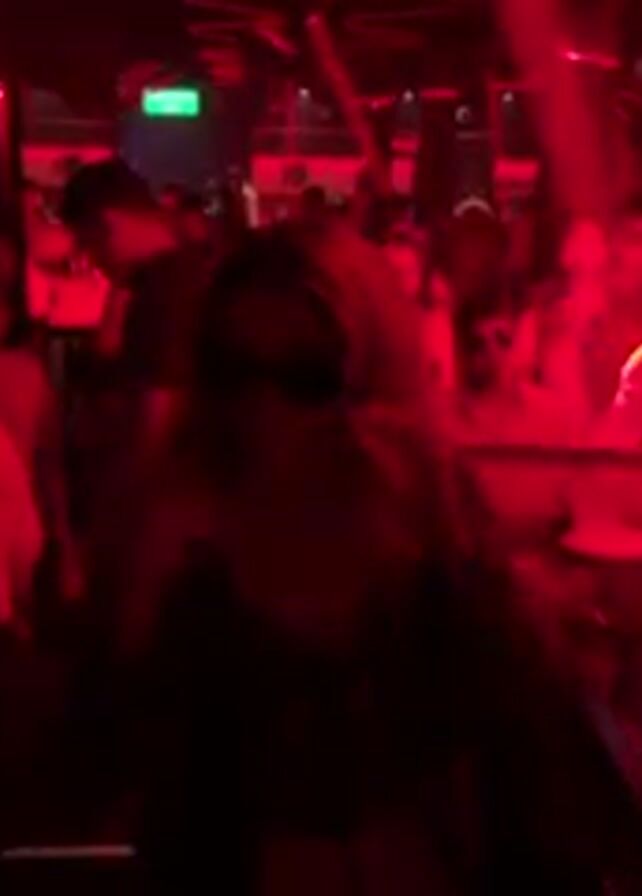 The video captures a bustling nightclub scene under a red lighting scheme