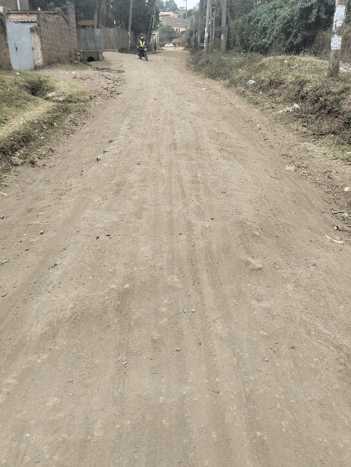 A dirt road stretches into the distance, flanked by foliage and utility poles. A lone motorcycle approaches in the distance, further down the dusty path. Buildings and structures stand on either side, adding to the scene of a rural neighborhood. The road's surface is uneven, showing signs of wear and erosion.