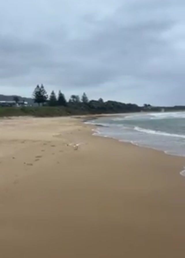 sandy beach on a cloudy day. The sand is mostly flat and light brown, with visible footprints. A single seagull stands on the sand, facing the water. The water is a mix of blue and white, with gentle waves lapping at the shore. In the background, there is a grassy area with a few trees and a couple of houses. The sky is overcast, creating a subdued, grey light. The overall impression is of a quiet, overcast day at the beach with calm waves and little activity.