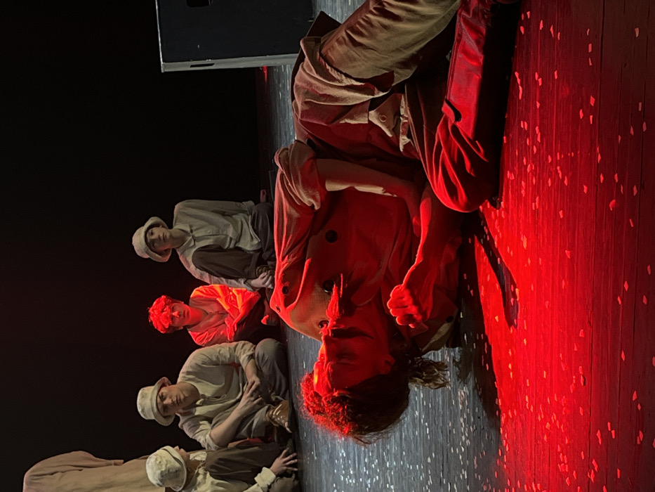 The image depicts a theatrical performance on a wooden stage, potentially located in Novoshakhtinsk, Russia. In the foreground, one individual lies prone on their left side, illuminated by intense red stage lighting. This person wears a light-colored, long-sleeved tunic with dark buttons and dark trousers; their long, dark, curly hair is visible, and their hands are clasped near their chest, with their head tilted backward and face angled upwards. Behind the prone figure, five other individuals are seated in a semi-circle on the stage floor. Three of these individuals wear light-colored bucket hats along with light-colored tunics and dark trousers. The central seated figure among them is also prominently highlighted by the red stage lighting, causing their attire to appear orange-red. All seated figures maintain a posture of observation. The stage floor is littered with numerous small, light-colored paper fragments or confetti. The background is dark, and a large, dark, rectangular object, consistent with a speaker or stage prop, is visible on the far right side of the frame.