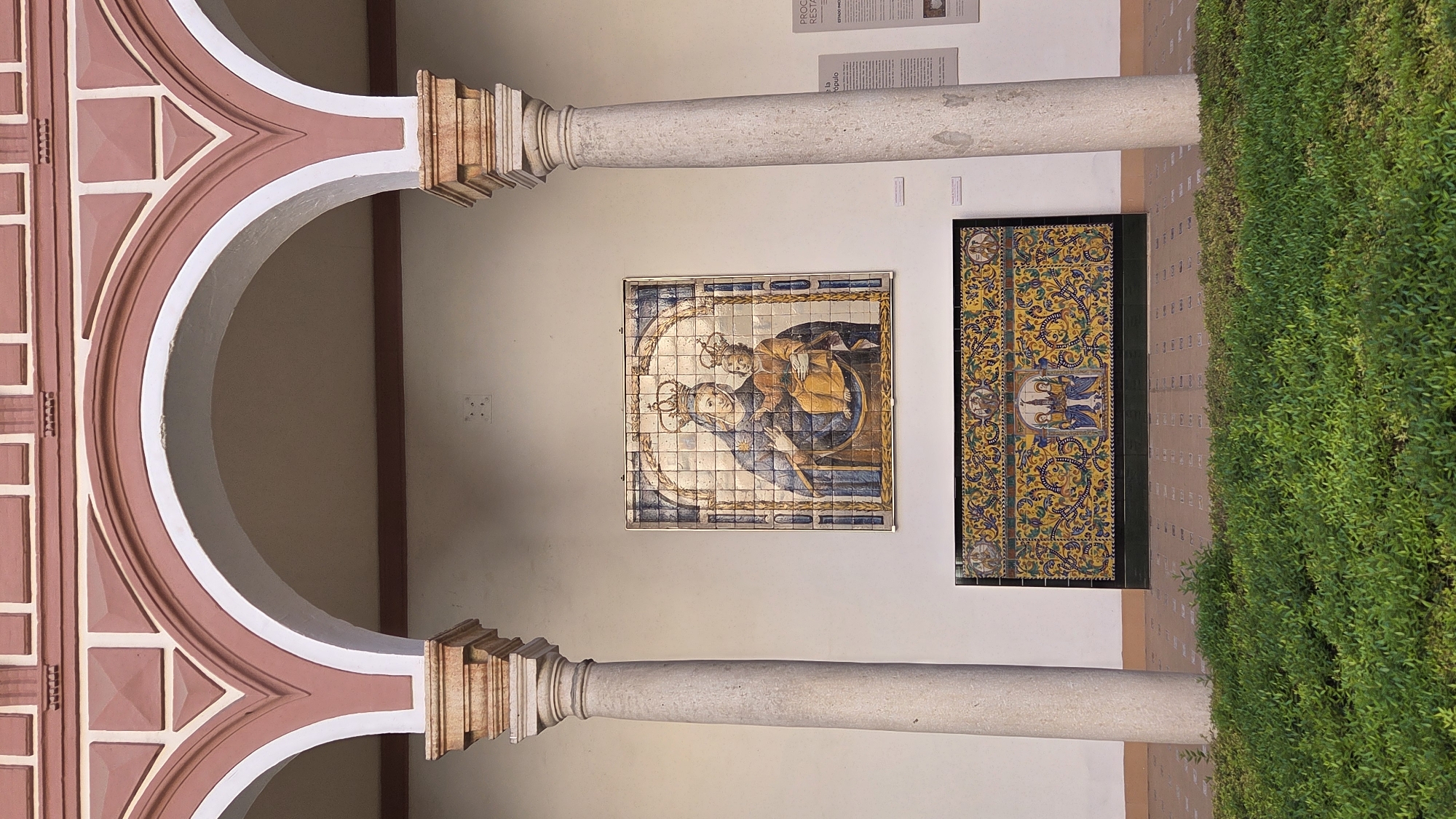 The image depicts a section of an architectural arcade, likely within a cloister or courtyard, at the Hospital de la Caridad in Seville, Spain. The foreground features a strip of dense green shrubbery. Behind this, a light brown tiled floor extends to a white wall adorned with two prominent ceramic tile artworks. Two classical-style columns with fluted shafts and decorative bases support a series of arches, painted reddish-brown with contrasting white interior edges. Above the arches, the building's facade is also reddish-brown, featuring geometric relief patterns. Centered on the white wall between the columns is a large rectangular tile panel, composed of numerous individual ceramic tiles, depicting the Virgin Mary holding the infant Jesus. Both figures are crowned, with Mary in blue robes and Jesus in yellow/orange, set within an oval border and a rectangular blue and white frame. Directly below this, a longer, narrower decorative tile panel extends horizontally, featuring intricate yellow and blue floral and scroll motifs with small religious figures at its center and ends, framed by a black border. To the right of the main tile panel, several small informational plaques are affixed to the wall, including a larger one with Spanish text discussing a "PROCEDIMIENTO DE RESTAURACIÓN." No individuals are present in the scene.