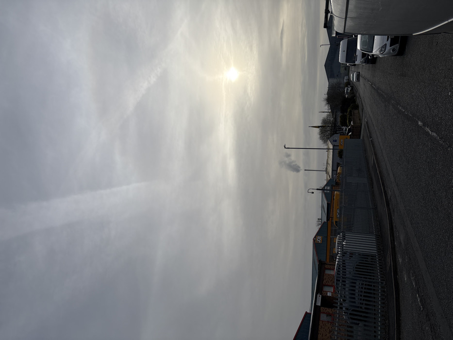 This image depicts an industrial or commercial road scene in Shrewsbury, United Kingdom, specifically appearing to be near the JCB service center at Centurion Park, Minton Lane, St. Giles. The sky is overcast and bright, with a muted sun visible in the upper right quadrant and two distinct contrails traversing the cloud cover. In the foreground, a dark asphalt road extends into the distance. A grey metal palisade fence runs along the left side of the road, behind which multiple vehicles are partially visible, including dark grey passenger cars. On the left side of the road, behind the fence, are several single and multi-story industrial-style buildings. One prominent building on the left has a red pitched roof and blue trim. Adjacent to it, a building facade displays a large yellow "JCB" logo. Further along this complex, more industrial structures with grey roofs are visible, interspersed with bare trees. A tall, dark street light pole stands prominently on the left, near an outdoor security camera mounted on a lower pole. In the midground, a light-colored vehicle, possibly a white sedan, is visible on the road, either stationary or in motion. Two vans, one dark grey and one white, are parked on the right side of the road, facing away from the viewer. The rear of the dark grey van is prominent in the far right foreground. In the background, a tall, slender industrial chimney emits a plume of light grey smoke into the sky. Additional large industrial buildings with dark grey corrugated roofs are discernible beyond the immediate structures. No individuals are visible in the scene.