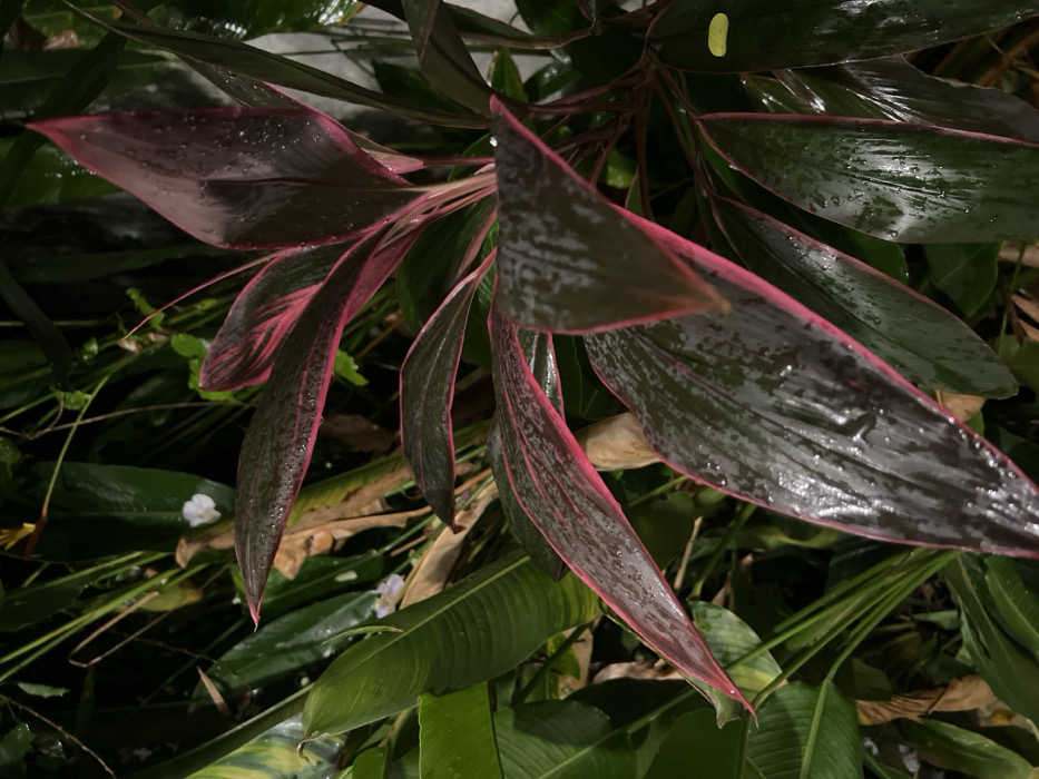 Dark-toned plants with reddish-pink edged leaves dominate the view