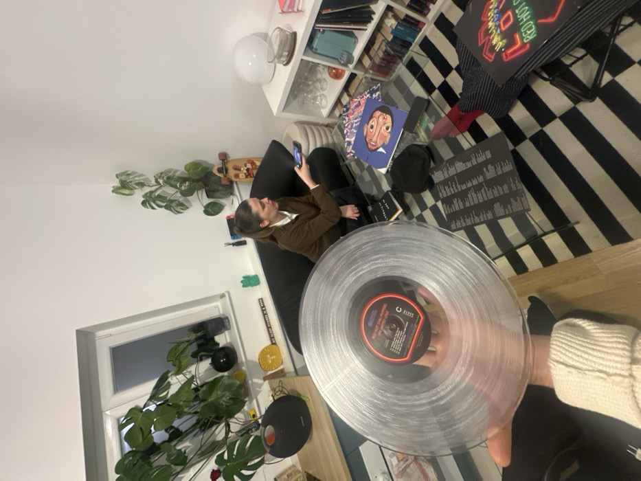 A person reclines on a dark grey sofa, using their phone. A clear vinyl record is held up in the foreground. A glass coffee table displays several vinyl album covers including Mac Miller and Red Hot Chili Peppers. A bookshelf is visible behind the sofa with various items. A window with plants sits to the left. The floor has a black and white striped rug.