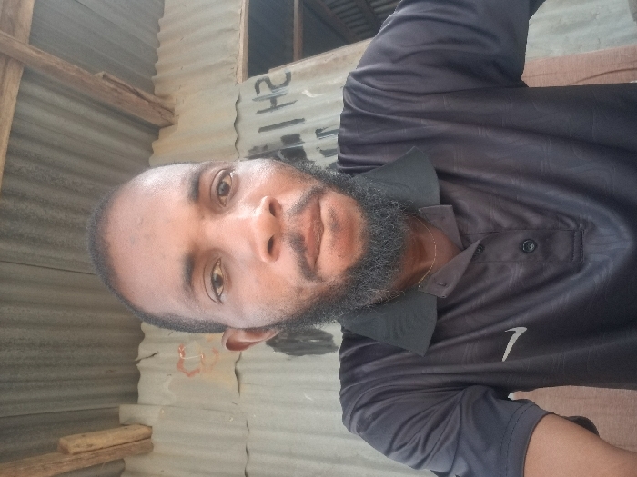 A male subject with dark skin, short dark hair, and a full beard is depicted in a close-up, front-facing photograph. He is wearing a dark grey polo shirt with a black collar, featuring a white Nike swoosh logo on the left chest. A thin gold-colored chain is visible around his neck. The subject maintains a neutral expression, looking directly at the camera. The background consists of weathered corrugated metal sheets, likely zinc, with traces of red discoloration on the left side and a partial inscription "I H2" on the right. Visible above are two horizontal wooden beams, suggesting part of a roof or overhead structure. The scene is located in Adankolo, Nigeria.