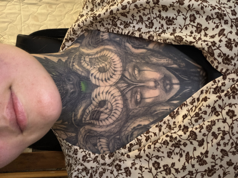 An indoor scene in Chaikovsky, Russia, depicts a close-up view of an individual from the lower face to the upper chest. The person has fair skin, with a visible lower lip and chin. The neck and upper chest are extensively covered in dark ink tattoos. On the neck, a stylized creature's head, possibly reptilian, features a prominent green glowing element within its mouth or throat area. Below this, on the upper chest, a detailed female face tattoo is present, characterized by white, glowing eyes from which dark markings descend, a septum piercing, and tribal-like markings on the chin. Above the female face are large, intricately patterned, coiled structures resembling horns or snakes. The individual wears a V-neck top with a light background and a dark brown floral pattern. The blurred background to the left shows a dark vertical object, while the right displays a light-colored, textured surface. No specific actions are discernible.