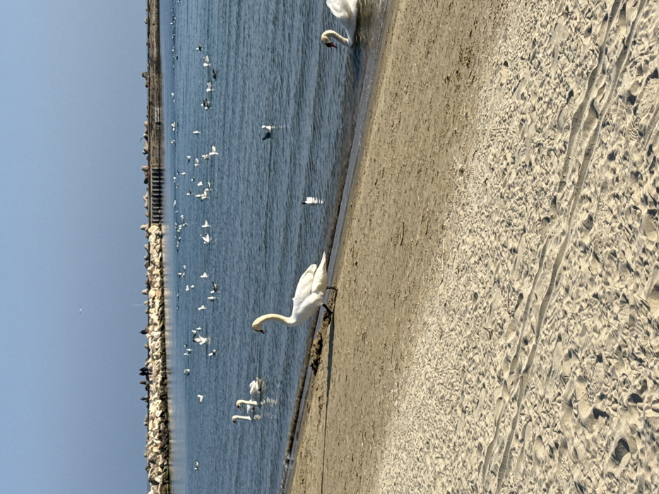 The image depicts a coastal scene in Varna, Bulgaria, under clear skies. The foreground features a light tan sandy beach exhibiting tire tracks and footprints. The mid-ground contains calm, light blue-grey water with minor surface ripples. Four white swans are present: one is prominently walking from left to right on the wet sand at the waterline, with its head turned right; two others are swimming in the water further left; and a fourth swan is partially submerged at the water's edge on the far right. Numerous small white and grey birds, identified as gulls, are distributed across the water's surface. In the background, a long breakwater, constructed from large rocks, extends horizontally across the frame. Several indistinct human figures are visible standing or walking atop this breakwater. The sky above the horizon is clear and light blue.