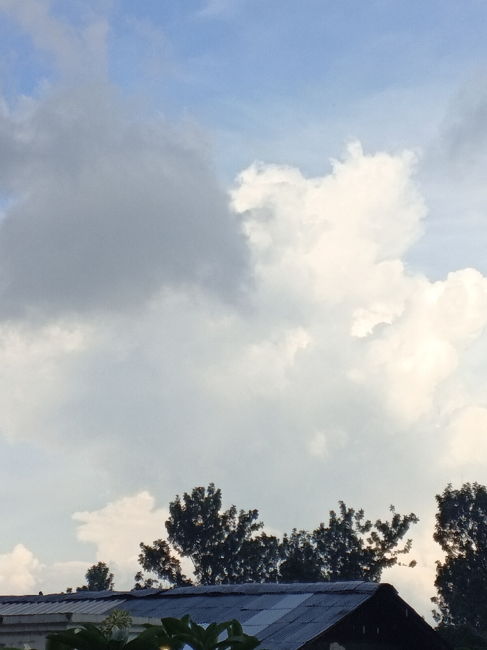 The scene depicts an outdoor environment in Akshatau, Kazakhstan. The upper two-thirds of the image are dominated by a sky with significant cloud cover. A large, dark grey cloud formation is prominent in the upper left, while brighter, white cumulus clouds are visible across the center and right, interspersed with patches of light blue sky. Below the cloud layer, the dark green canopy of multiple trees forms a horizontal line above a structure. The lower section of a corrugated metal roof, exhibiting a gentle downward slope to the right, occupies the bottom portion of the frame. In the extreme bottom left, light green foliage is partially visible, obscuring the foreground in front of the roof. No human figures or discernible activities are present.
