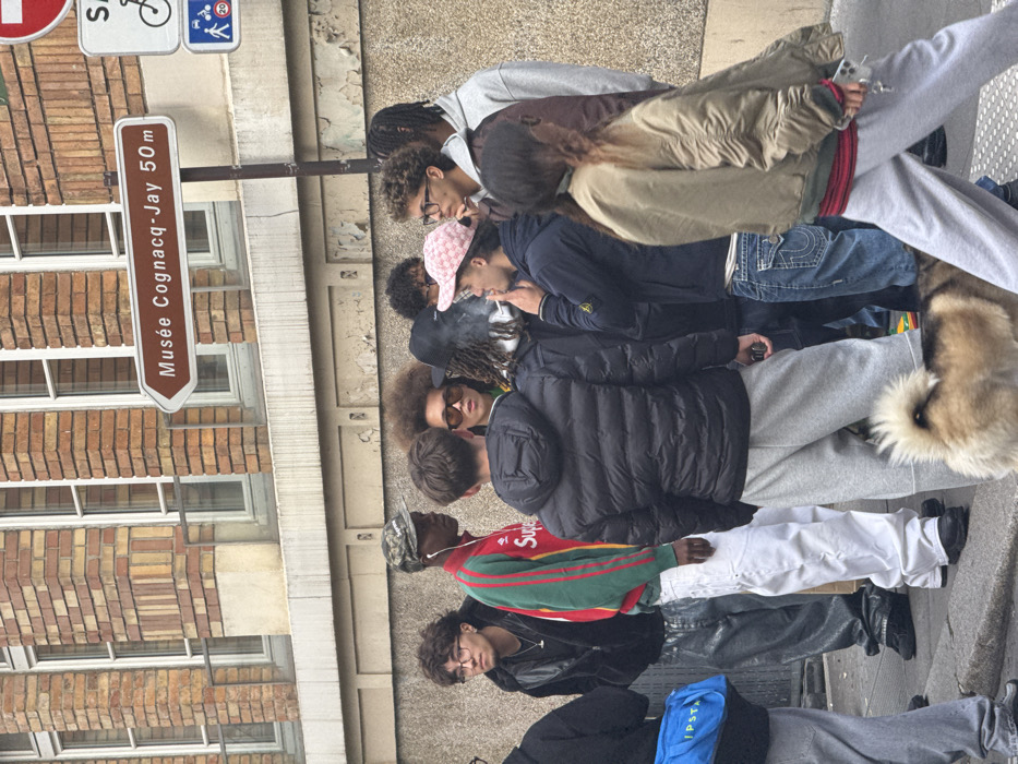 The image displays a street scene in Paris, France, identifiable by a brown directional sign indicating "Musée Cognacq-Jay 50m." Approximately ten young individuals, predominantly male, are gathered on a concrete sidewalk. The background features a multi-story brick building with multiple white-framed windows and a weathered, light-colored lower wall. Key subjects and actions include: * A Black male wearing a camouflage "Supreme" baseball cap, a red, green, and yellow striped "Supreme" long-sleeve shirt, and white pants, with a white earbud in his left ear. * A male with his back partially to the camera, wearing a black puffer jacket and grey sweatpants. * An individual with a prominent afro, wearing sunglasses. * A person with dreadlocks and a black baseball cap, exhaling smoke, suggesting a cigarette or vape. * A young male wearing a pink checkered baseball cap, a dark blue jacket with a "Stone Island" patch on the left arm, and blue "True Religion" jeans, holding a cigarette or vape to his mouth. * A female with long brown hair, wearing a light brown bomber jacket and grey sweatpants, walking from right to left while holding a mobile phone in her right hand. * A small, light-colored, fluffy dog is partially visible in the lower foreground. * A blue bag with the text "IPSTA" is visible on the far left. The individuals are dressed in casual streetwear, including hoodies, jeans, and sweatpants, and appear to be standing or engaging in conversation.