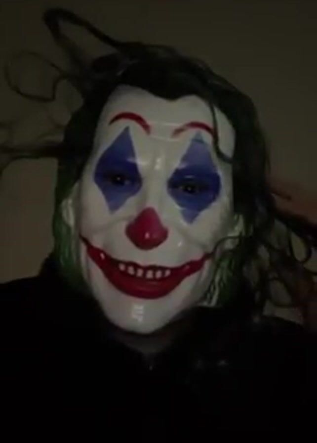A person wearing a Joker mask with green hair is visible from the chest up, against a dimly lit beige or light brown wall