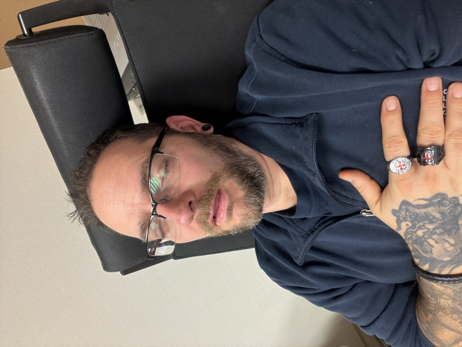A male individual is observed in a medium shot, seated in a black office chair with a mesh headrest, within an indoor environment in Grevenmacher, Luxembourg. He possesses dark hair, a beard, and a mustache. He wears black-framed glasses, and black ear gauges are visible in both earlobes. His eyes are closed, and his mouth is slightly agape. The individual is dressed in a dark blue zip-up jacket over a dark blue t-shirt. His left forearm is adorned with a dark, intricate tattoo sleeve, and a black braided bracelet is worn on his left wrist. On his left hand, a silver-toned ring featuring a red cross on a white field is on his ring finger, and a dark metal ring with a red shield-like emblem is on his middle finger. His left hand is positioned flat against his upper left chest. The background consists of a plain, light-colored wall.