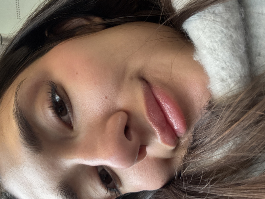 A close-up portrait shot of an individual, identified as female, is depicted, likely taken in an indoor setting within Petrovaradin, Serbia. The subject's face fills the majority of the frame, viewed from a slightly upward and angled perspective. She has dark brown eyes with long, defined eyelashes, dark eyebrows, a straight-bridged nose, and full, glossy lips with a pinkish tint, forming a subtle, closed-mouth smile. A small mole is visible on her right cheek. Her skin tone is light-to-medium. Dark brown hair frames her face, particularly visible along the lower left quadrant. She is wearing a light-colored, textured garment, likely a white or light grey high-neck sweater, visible along the bottom and lower right edge of the image. The background is indistinct and out of focus, providing no specific environmental details beyond suggesting an interior space.