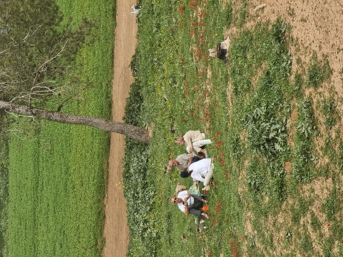 The scene is situated outdoors within the Lachish Regional Council, Israel. Four adults are observed seated on a patch of ground covered with green vegetation and scattered red flowers. From the left, a male with a bald head and sunglasses, wearing a white short-sleeved shirt and dark trousers, holds a white smartphone. Next to him, a female with dark hair pulled back, dressed in a white long-sleeved shirt and light-colored trousers, is seated facing inwards. Adjacent to her is a male with glasses and short hair, wearing an olive-green long-sleeved shirt and dark trousers, who appears to be looking towards the female. To the right, a female with light-colored hair, attired in a light beige long-sleeved top and matching trousers, is seated leaning back slightly. A small, light-colored surface, possibly a low table or blanket, holding indistinct items and an orange thermos, is positioned central to the group. The ground directly surrounding the individuals is uneven, featuring a mix of green grass, exposed reddish-brown soil, and numerous small red flowers. A tree stump is visible on the right side of this area. Behind the seated group, a tall, slender coniferous tree with dark bark and some bare upper branches rises, casting a shadow. A distinct dirt path separates the midground from a large, uniformly green agricultural field in the background. Two white, irregular objects are discernible near the edge of the green field, adjacent to the dirt path, on the far right. Bright daylight illuminates the scene.
