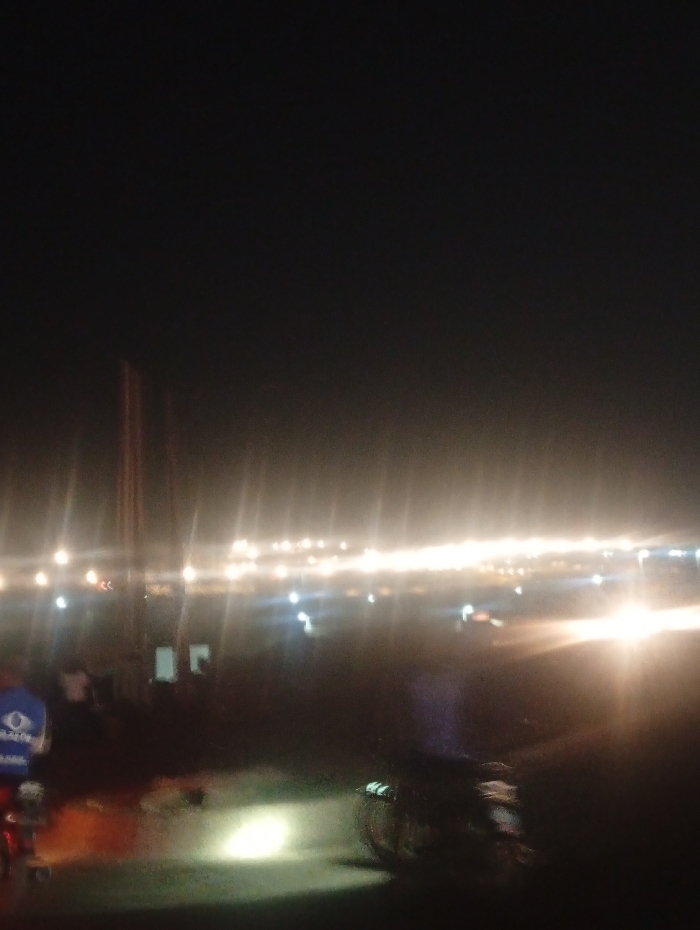 The image depicts a nighttime street scene in Abuja, Nigeria. The environment is dark, illuminated by multiple artificial light sources that produce significant glare and lens flares. In the foreground on the left, the rear section of a motorcycle is visible, occupied by an individual wearing a blue garment with a white circular logo. A prominent, bright green-yellow light, consistent with a vehicle's headlight, illuminates a patch of ground in the lower-left quadrant. To the right of this light, an indistinct dark form, possibly another motorcycle, is partially discernible. The mid-ground contains faint, dark vertical structures and vague lighter shapes, largely obscured by the low light and glare. The background is dominated by a continuous horizontal array of intense white and yellow lights, indicating a distant active roadway or a densely illuminated urban area.