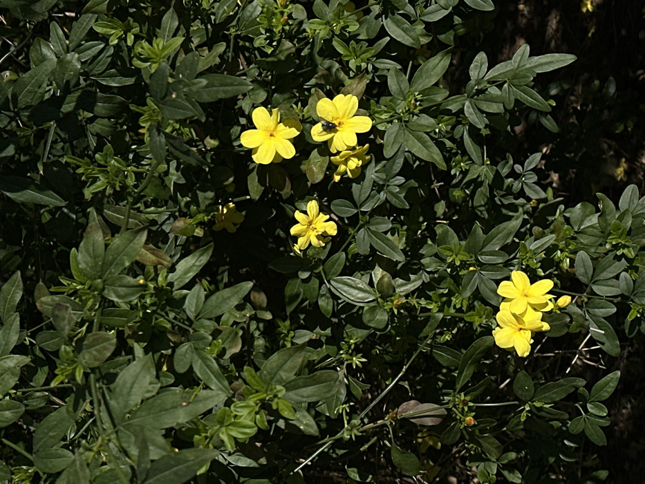This image displays a dense section of a green leafy plant, identified as being in Polje, Montenegro. The foliage consists of numerous dark green leaves, exhibiting varied shapes including ovate and trifoliate forms, and is heavily clustered. Several bright yellow flowers, each typically presenting with five or six petals, are distributed throughout the frame. A small, dark-bodied insect, consistent with a fly or bee, is observed resting on the petals of one of the yellow flowers in the upper-right portion of the image. The scene is illuminated by direct sunlight, creating distinct highlights on the leaves and flowers and casting shadows within the dense plant growth. No human figures or artificial structures are discernible.