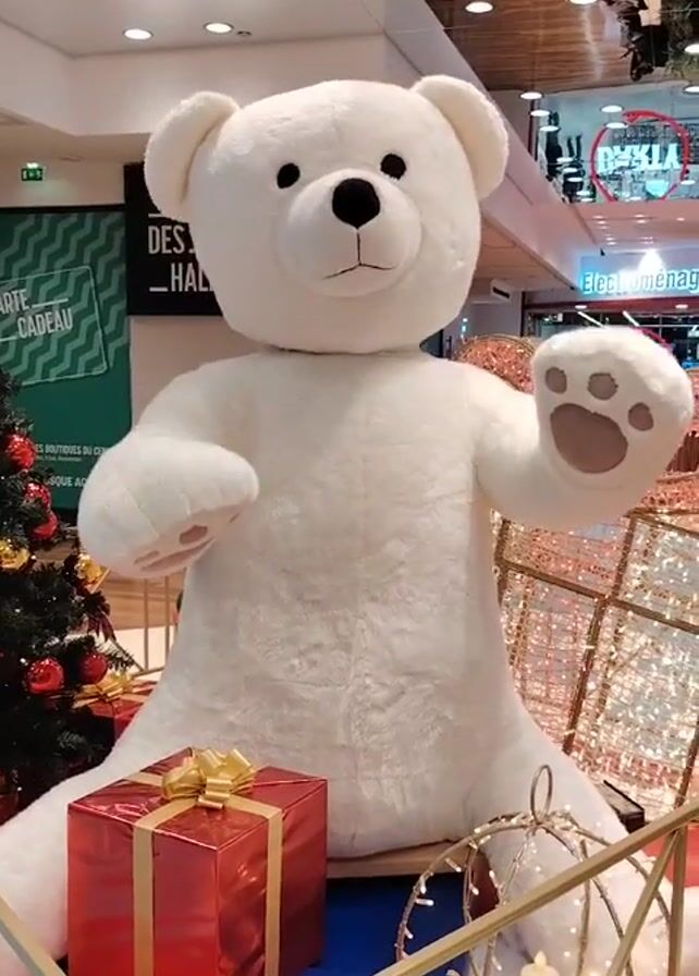 large, white teddy bear sitting on display in a shopping mall. The bear is surrounded by Christmas decorations, including a Christmas tree, presents, and lights. The camera is relatively still, capturing a steady shot of the scene. The lighting is bright and artificial, typical of a shopping mall. In the background, there are signs for stores and electronic devices, indicating that the video was taken in a commercial setting.