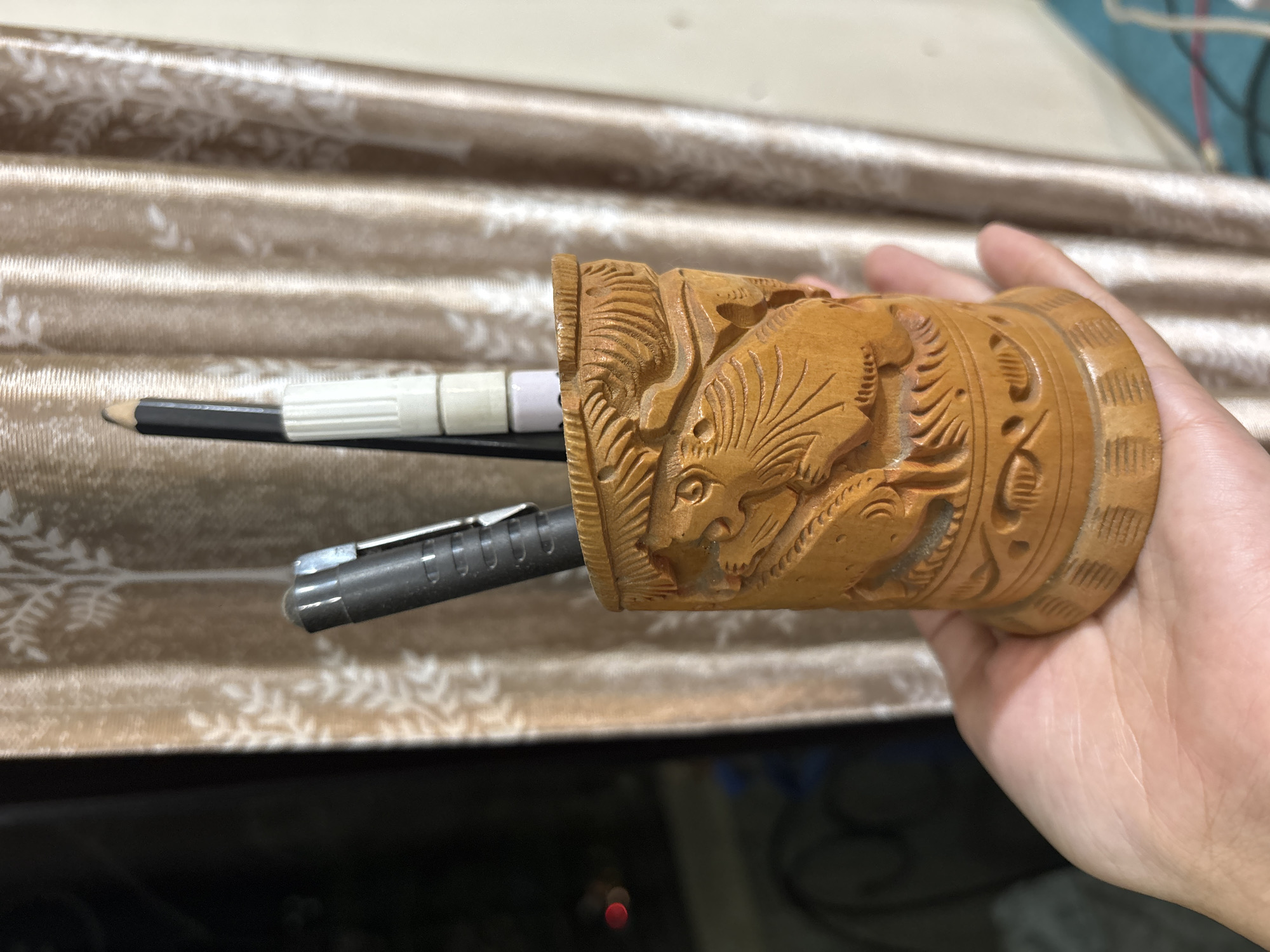 An indoor scene in Ulhasnagar, India, depicts a light-skinned human hand holding a carved wooden cylindrical pen holder
